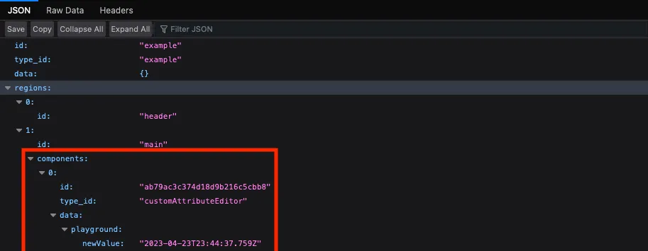 of our custom attribute editor definition JSON file. This file is the one added to the iFrame our